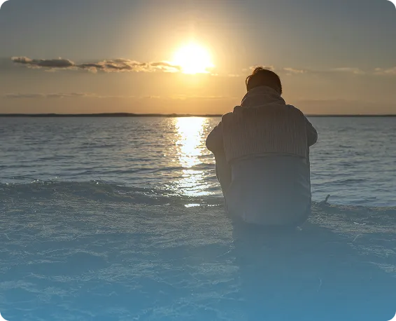 Person meditating on a beach at sunset with eyes closed—mindfulness, calm breathing, relaxation, and mental wellness.